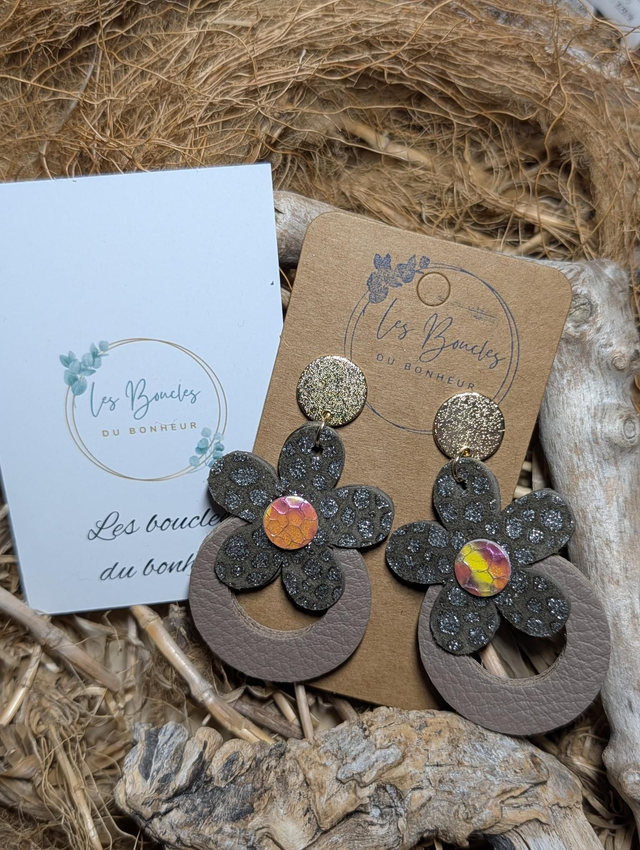 Ces boucles d'oreilles en forme de fleur, d'un diamètre de 3,5 cm, allient originalité et féminité. Confectionnées avec soin avec des chutes de cuir, elles sont le détail parfait pour sublimer n'importe quelle tenue, de jour comme de soirée.