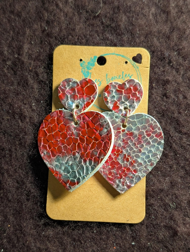 Boucles d’oreilles en forme de cœur, faites main à partir de chutes de cuir recyclées, dans une démarche éco-responsable.