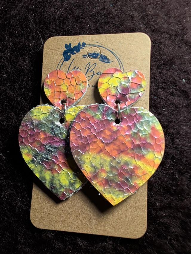 Boucles d’oreilles en forme de cœur, faites main à partir de chutes de cuir recyclées, dans une démarche éco-responsable.